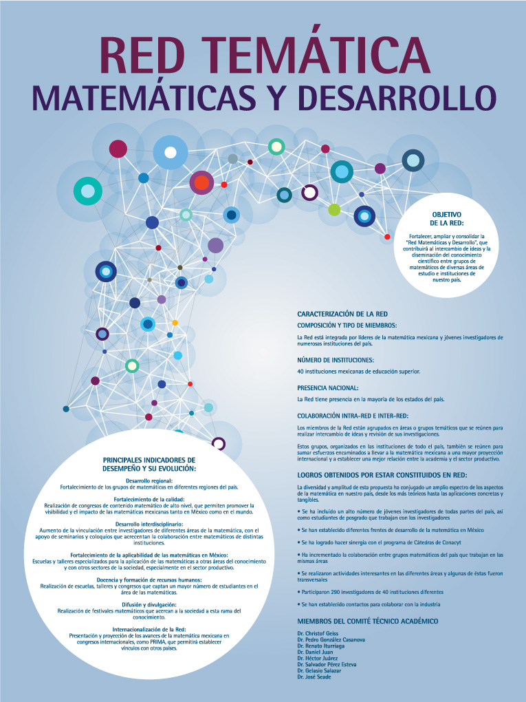 Las matemáticas son el termómetro que mide el grado de desarrollo de los pueblos, sin tecnología no hay desarrollo, sin ciencia no hay desarrollo tecnológico sustentable y sin matemáticas es difícil hablar de ciencia, pues éstas permean todo el conocimiento científico y tecnológico. Hoy en día la calidad de vida de las poblaciones está íntimamente relacionada con el conocimiento matemático que éstas tengan. El objetivo de esta propuesta es establecer una red de colaboración en matemáticas, con un espectro de temas muy amplio, que coordine a líderes de la matemática nacional, investigadores y profesores de diversas partes del país, con jóvenes investigadores, para acrecentar el impacto de las matemáticas en el país, coadyuvando a mejorar la enseñanza e investigación en matemáticas y ayudando a formar recursos humanos altamente calificados; que incremente la colaboración entre investigadores que trabajan en instituciones mexicanas de educación superior, e impulse la vinculación de las matemáticas con otros sectores de la sociedad.
